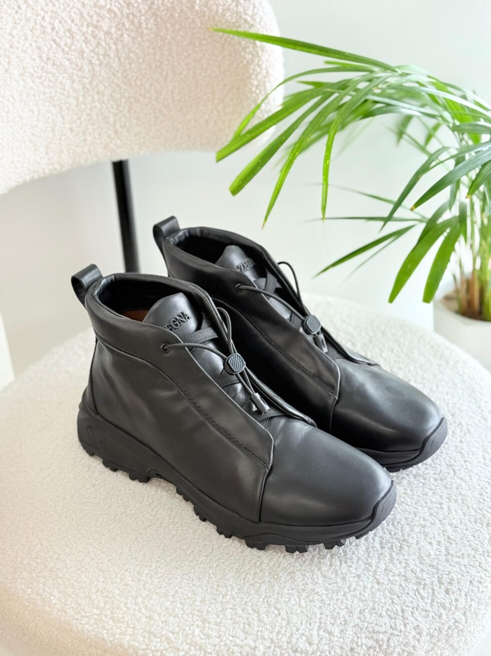 Zegna Triple Stitch Leather High Top Black Sneakers